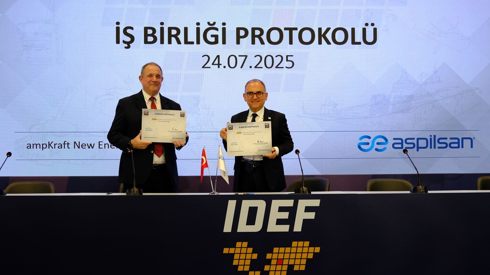 A cooperation protocol was signed between ASPİLSAN Energy and ampKraft New Energy PTE. Ltd. as part of IDEF 2025.